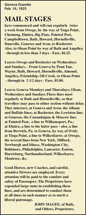 John Magee owned large tracts of timber land in Michigan and Wisconsin, and was involved in land speculation, lumbering, milling, as well as stage coach and banking interests. Between 1818 and 1826, he served as constable and collector of Bath, NY, and deputy sheriff, high sheriff, and census marshal for Steuben County. Around the same time, along with other partners, he established stage coach lines and transported U.S. mail under contract in New York State, later expanding to Pennsylvania and Washington. ("The first stage passed through Tyrone, New York, in the year 1821, owned by John Magee of Bath.") Active in Democratic politics, he became a Congressman in 1826, turning operation of the stage lines over to his brother, Thomas Jefferson Magee. He served two terms in the House of Representatives, during which he was an advisor to President Andrew Jackson. He directed the affairs of the newly organized Steuben County Bank from 1831 until his death.